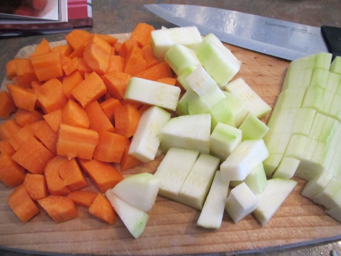 2. While the meat is cooking, chop up the onion, garlic and vegetables.