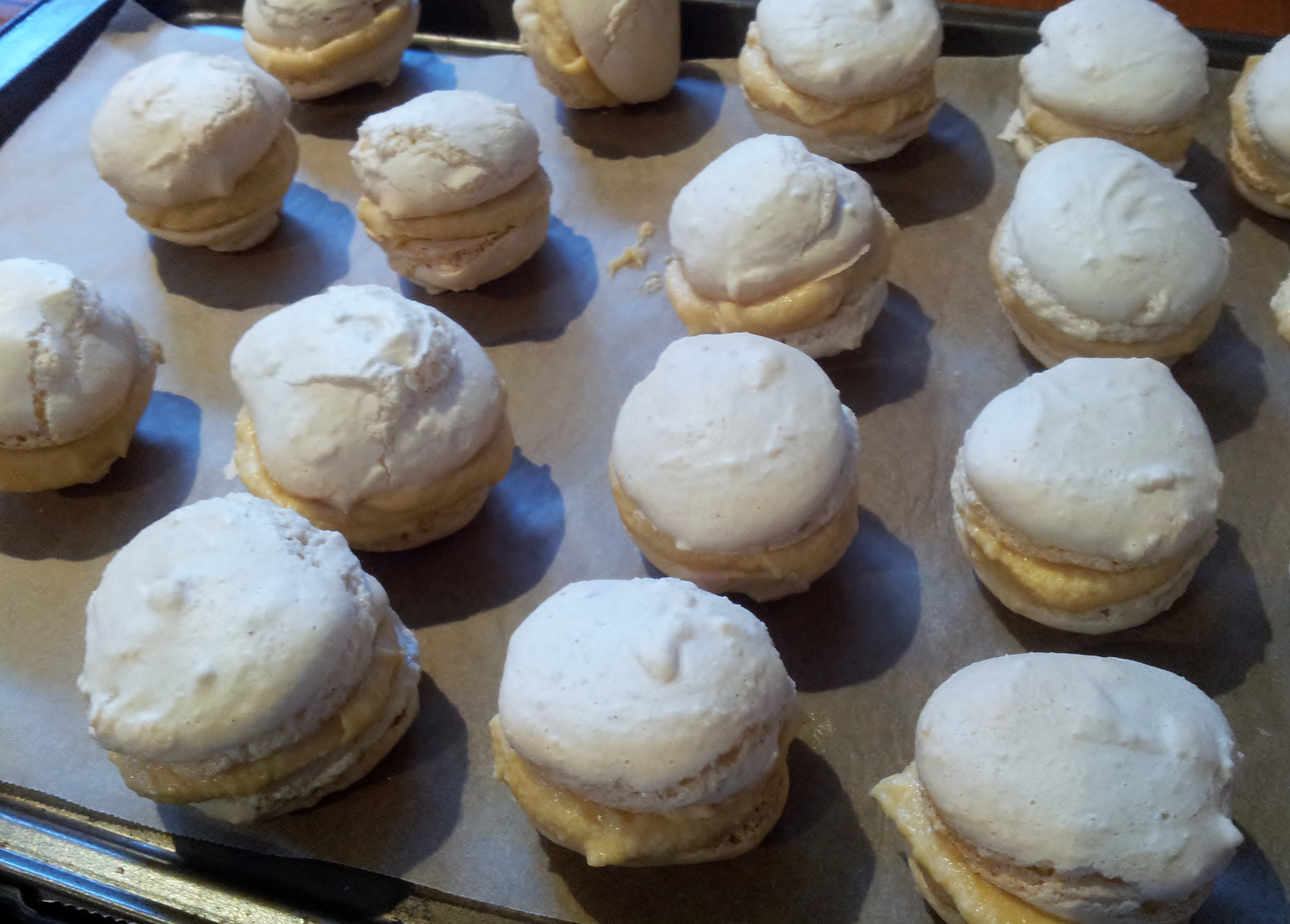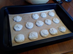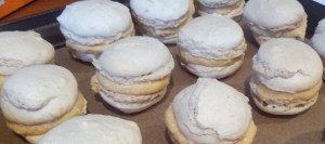 Now heat your oven to 130 and bake the macarons for 15 minutes. If you have not used food colouring, they may colour slightly, although this should be avoided if possible.