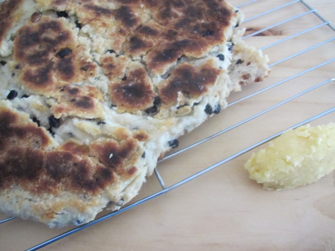 5. Lift the round onto the prepared hot fry pan or griddle and cook on a gentle heat for 5 minutes on one side. Turn and cook for a further 5 minutes. Slide the Singin’ Hinny to a wire rack and allow to cool slightly. Mary Berry suggests you split and butter it and then sandwich it back together. I thought it was too delicate to do on the whole and will leave it to the discretion of the eater (and it is perfectly fine without the butter!)