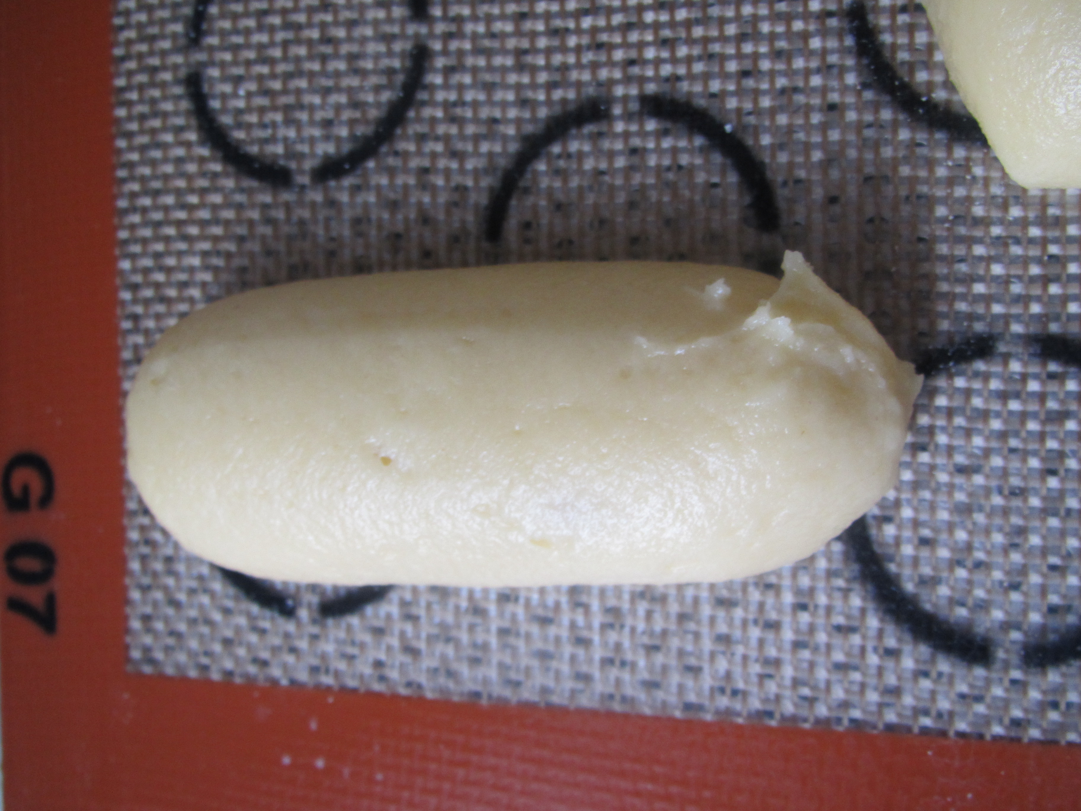 5. Fill a pastry bag with pastry and pipe onto the baking tray. I piped them in the shapes of eclairs but if you are making profiteroles you would pipe circles to create little round balls.