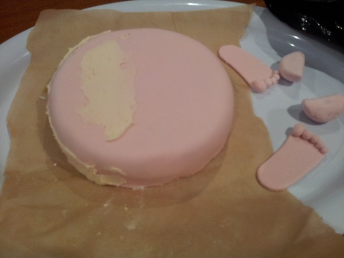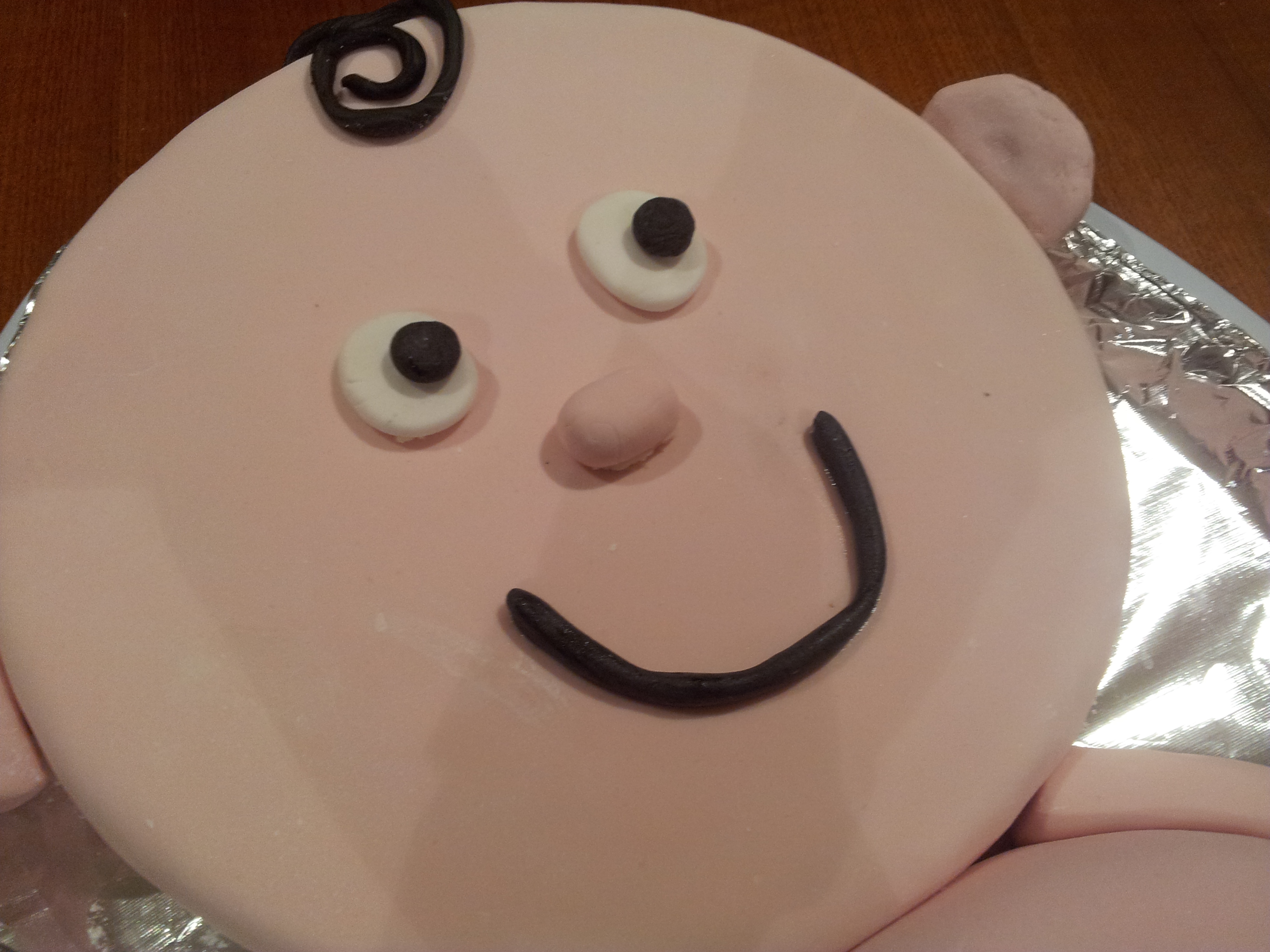 To make the feet, print the template from the Wilton website and use them to trace the feet out of paper. Make each toe by rolling a small ball of pink fondant until you have the correct size. I found each piece had to be kneaded a little to give a smooth finish. Glue toes to feet using the icing and then attach the feet to the nappy, again using the buttercream icing. To make the arms, simply shape logs of the pink fondant about 15cm long and position by the body on the serving board.