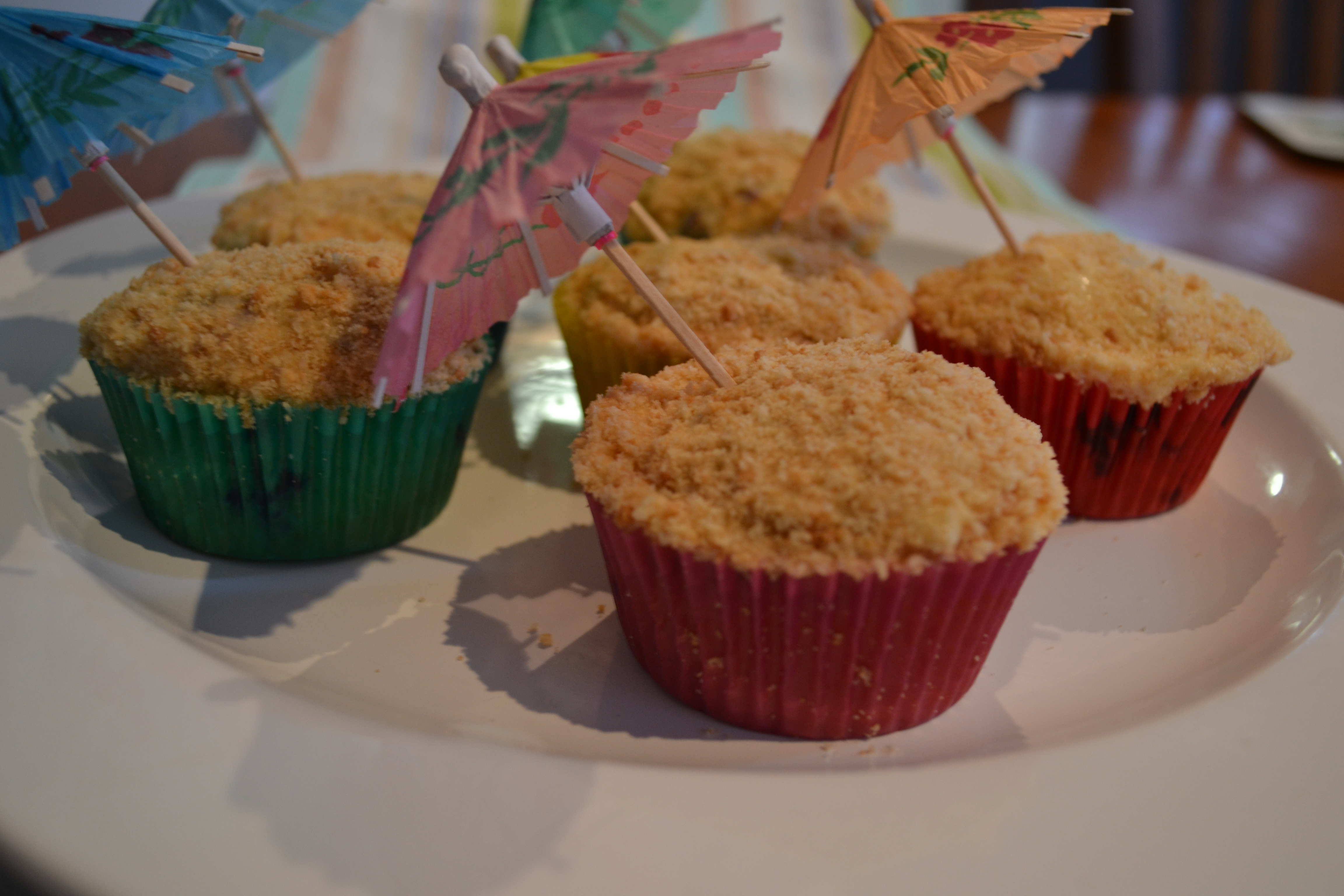 I made these for a friend’s birthday as a celebration of summer. With the biscuit ‘sand’ and the mini umbrellas, these recall long summer days spent at the beach. The blueberry cupcakes and lemon cream cheese icing pair beautifully together to make a delicious summer treat.