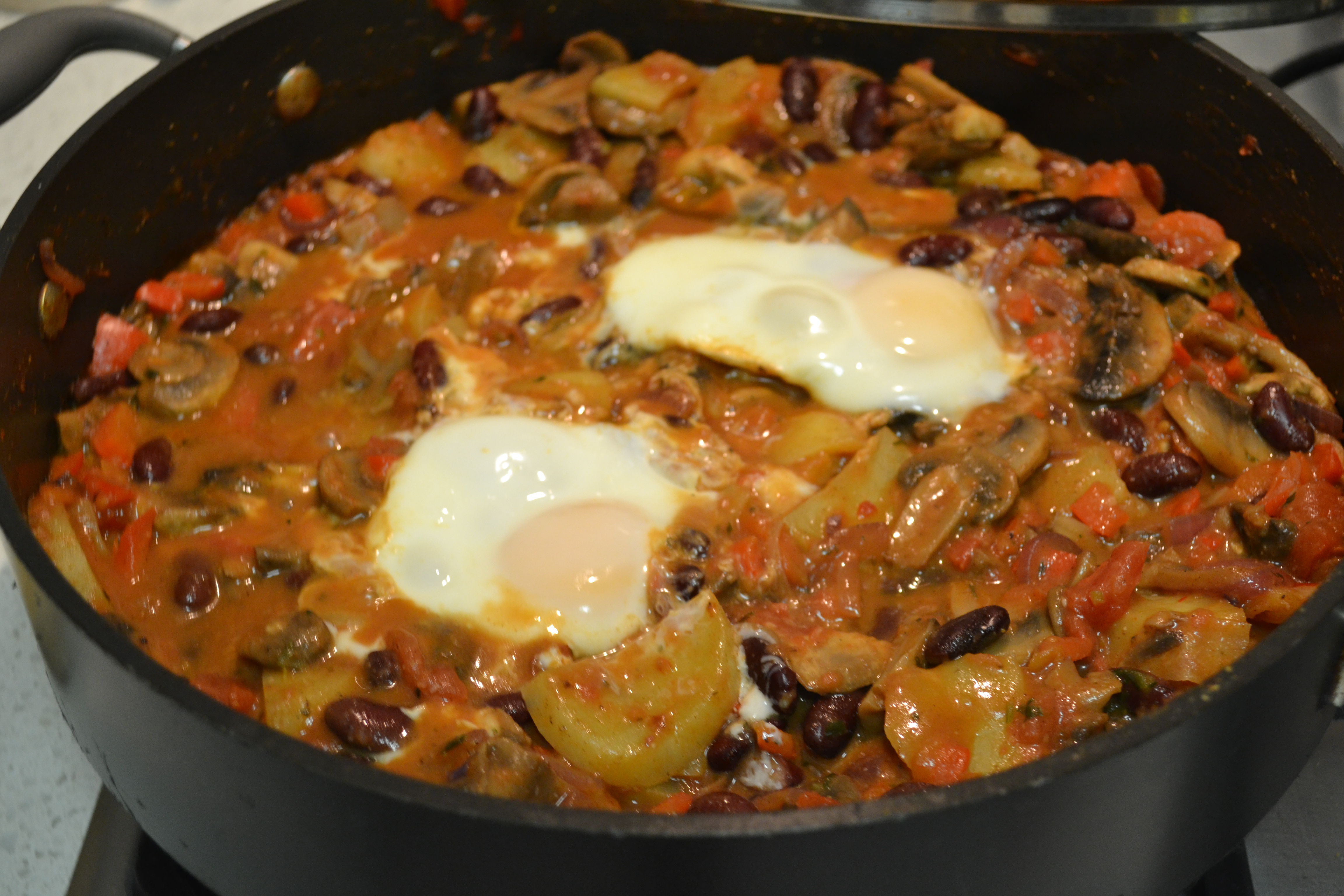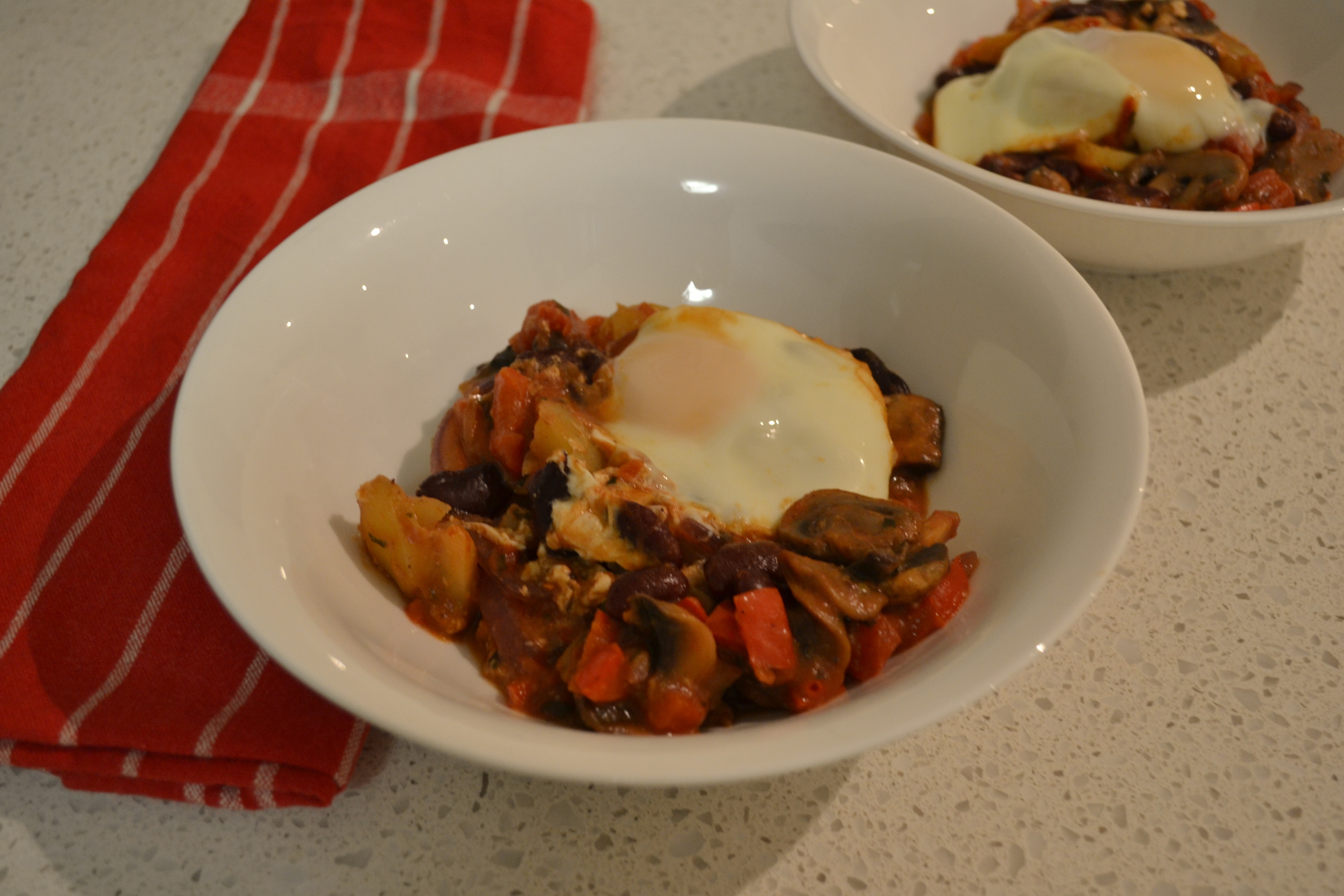Again, I can make no claims to the authenticity of this dish but it has been on breakfast café menus around Melbourne for some time now. I’m not sure whether it is traditionally a breakfast or dinner dish, but I made it for dinner this week and it was thoroughly enjoyed. I can see why it is favoured as a breakfast dish in Australia, containing many of the favoured weekend breakfast foods including beans, mushrooms, tomatoes and of course eggs.
