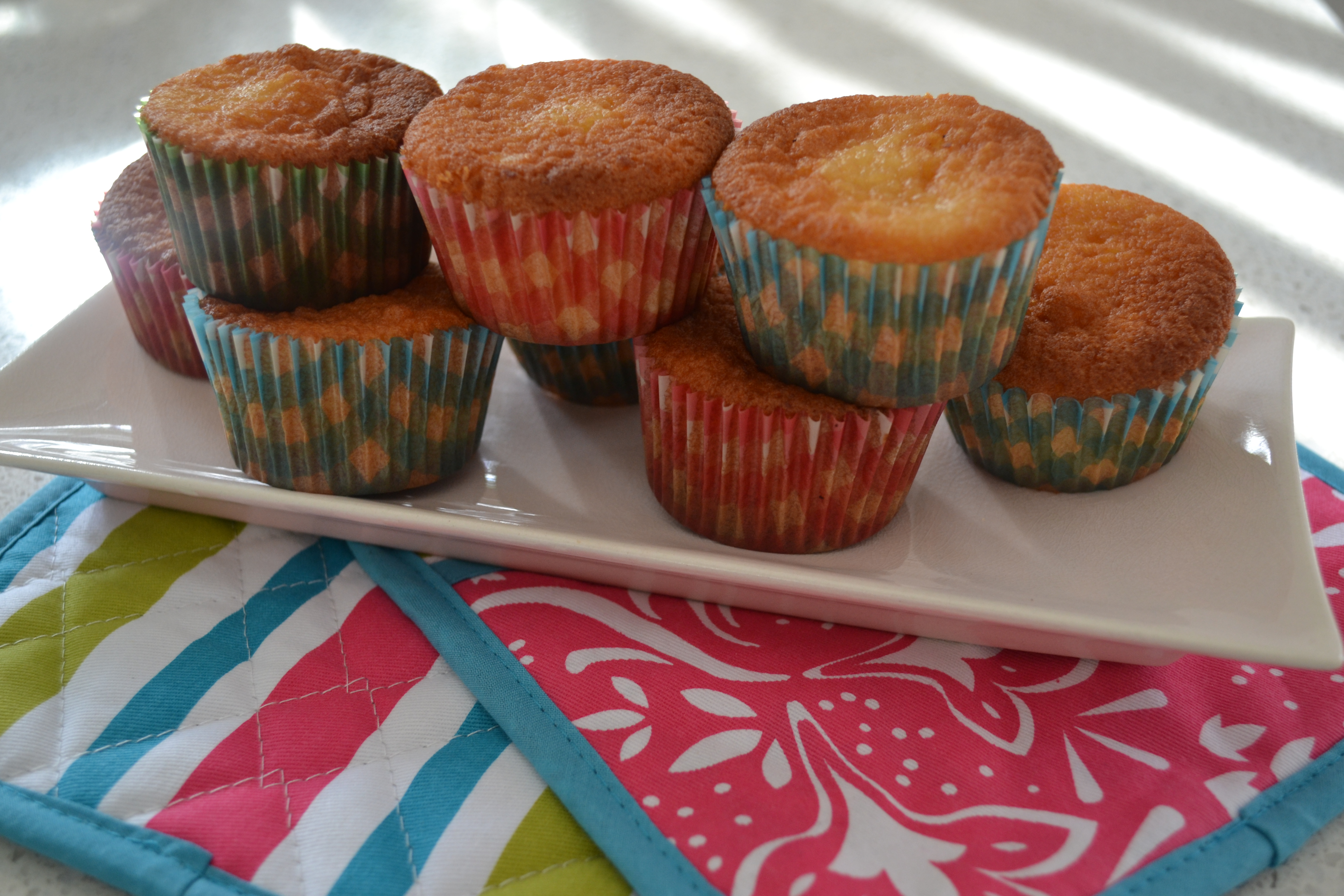 Spoon into the cupcake papers, filling each about half to two-thirds of the way up. Bake for 10-15 minutes. My oven seems to cook everything with furious speed so I pulled them out at about 7 minutes. Check at that point and see if they are golden brown and well risen. A skewer inserted into the middle will come out clean.
